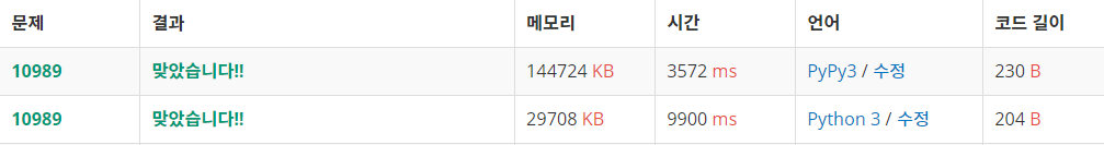 왜 같은 코드인데 메모리초과뜨지 >> pypy는 python보다 시간은 빠르지만 메모리를 더 많이 잡아먹는단다.